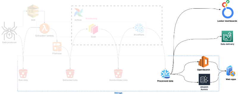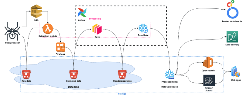 That brings us to the end of the last post in this series where we’ve traced our data flow from ingestion into the data lake, over transformation through AWS Lambdas, Dask, and Snowflake, to presentation in the data warehouse in Snowflake and the bespoke access layer on Amazon Aurora and Opensearch. As is probably clear from this architecture, we strongly believe in using the right tool for the job, not tailoring the job to the tools you have. The combination of a data lake with a data warehouse allows us to keep huge amounts of data without limiting either the performance of the queries we run today, or which queries we can run in the future.