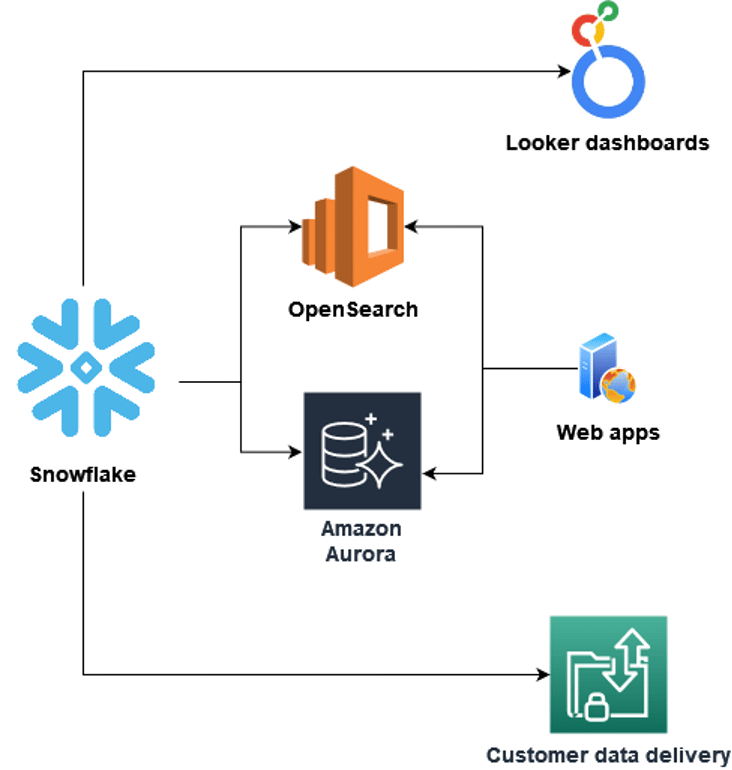 Our web application also includes free-text search boxes. Again, we found that Snowflake was not the best tool for the job here, but OpenSearch gave us the best performance for this type of queries, so we also replicate the data we need for this from Snowflake to OpenSearch.