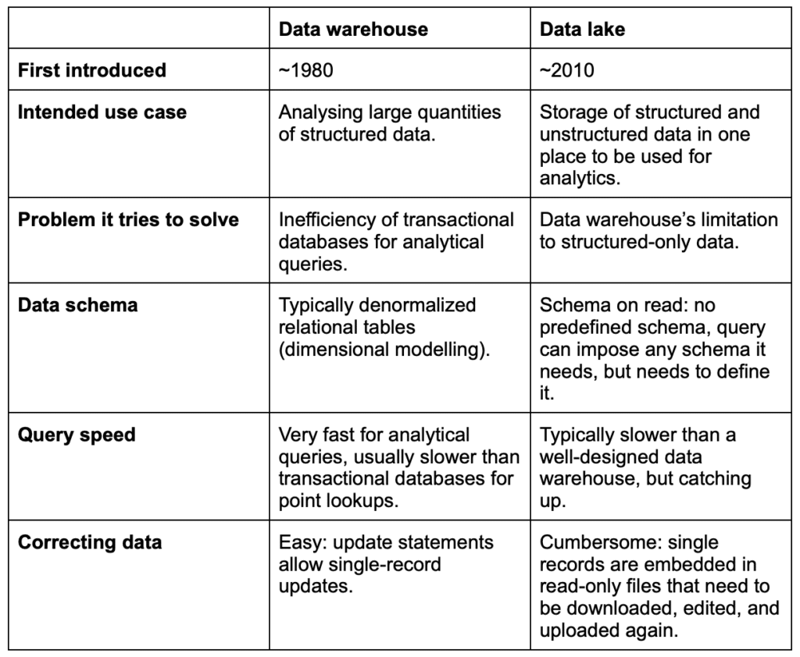 Data lakes and warehouses are two ways of managing data and getting value out of it, but they serve different use cases. The older of the two, the data warehouse, came to the fore back when transactional relational databases made up the vast majority of data systems in companies. As data analysis became more prevalent, people realised that the analytical queries they were running were very different from the typical transactional query: instead of looking up a single row and updating a value, you were now aggregating huge data sets and calculating metrics over them.