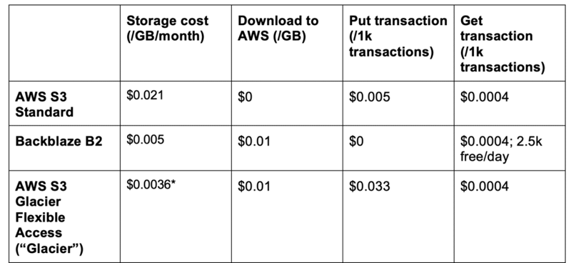 The amount of data we store always keeps growing though, and the probability of us needing to access this data quickly reduces over time. That is why we looked into alternatives for long-term, infrequent access storage that is even cheaper than S3. We compared S3 with Glacier and Backblaze B2, and have summarised some of the key differences in the table above. Keeping in mind that we don’t expect to download data very often from this long-term storage, it’s clear B2 is much cheaper than S3. Glacier would have been a serious contender, but for the fact that it comes with a minimum billable object size that happens to be about 2.5 times our average file size; this translates roughly in a real storage cost of $0.009 for us – much more expensive than B2. On top of that, B2 does not charge for upload transactions (while Glacier does), and they also offer an S3-like API so we can still access data on B2 as if it were on S3 when we need to. For all of these reasons we decided to offload our archive data to Backblaze B2.