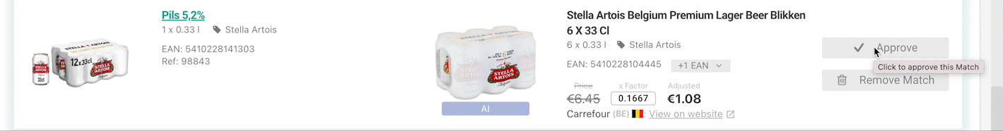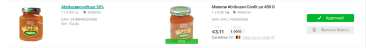 How does this happen, you might wonder? Firstly, you provide Daltix with a list of products you wish to track, which Daltix uses as a reference. After ingesting these reference products, our matching engine does its magic. Based on different algorithms, Daltix produces high quality matches between products of your assortment and the product at the retailer. EAN-based matches are automatically approved since we know they share the same barcode and match suggestions based on other algorithms are placed in review for your approval.